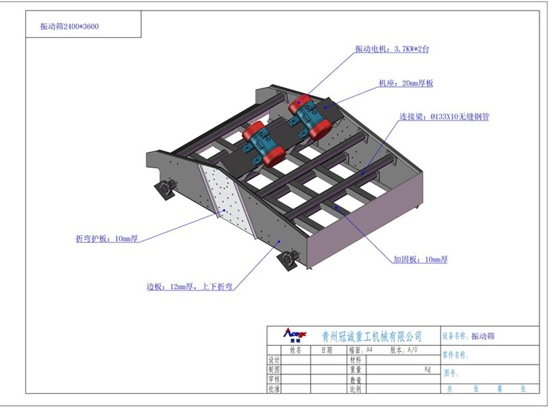 規格:2400*3600mm 振動電機:3.7KW*2臺 邊板厚度:12mm 料斗:板厚5mm |